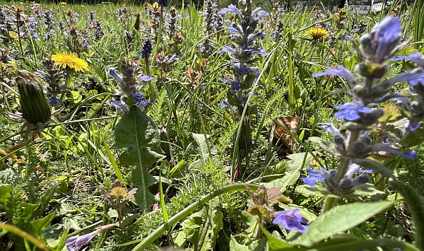 Im Bild: Kriechender Günsel. Doch der Rasen wechselt sein Kleid ständig - mal dominieren die gelben Löwenzahnblüten, dann weiße Gänseblümchen und ab und zu der blaue Kriechende Günsel.